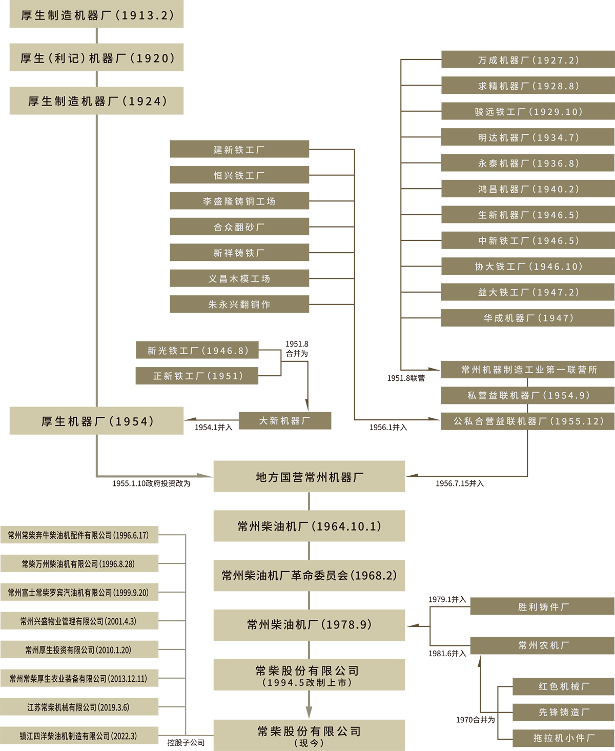 1913年2月,常柴前身企業(yè)厚生制造機(jī)器廠由常州民族企業(yè)家奚九如先生憑借愛國的熱情和良知,以實(shí)業(yè)救國為宗旨、以振興民族經(jīng)濟(jì)為己任而創(chuàng)立,這是常州地區(qū)第一家機(jī)械工廠,也是中國最早的內(nèi)燃機(jī)專業(yè)制造商之一。當(dāng)年厚生廠仿造成功出8馬力火油發(fā)動機(jī)。