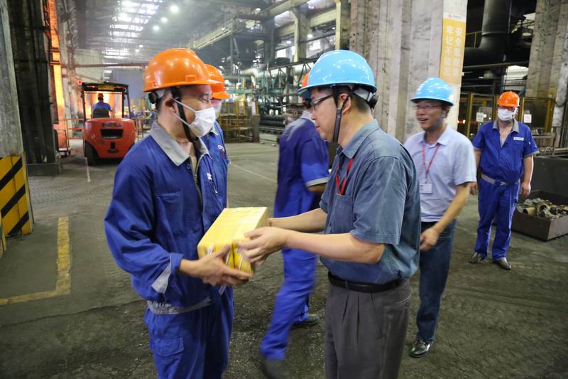 查看更多 >>圖為薛國(guó)俊董事長(zhǎng)向鑄造廠員工送上慰問品