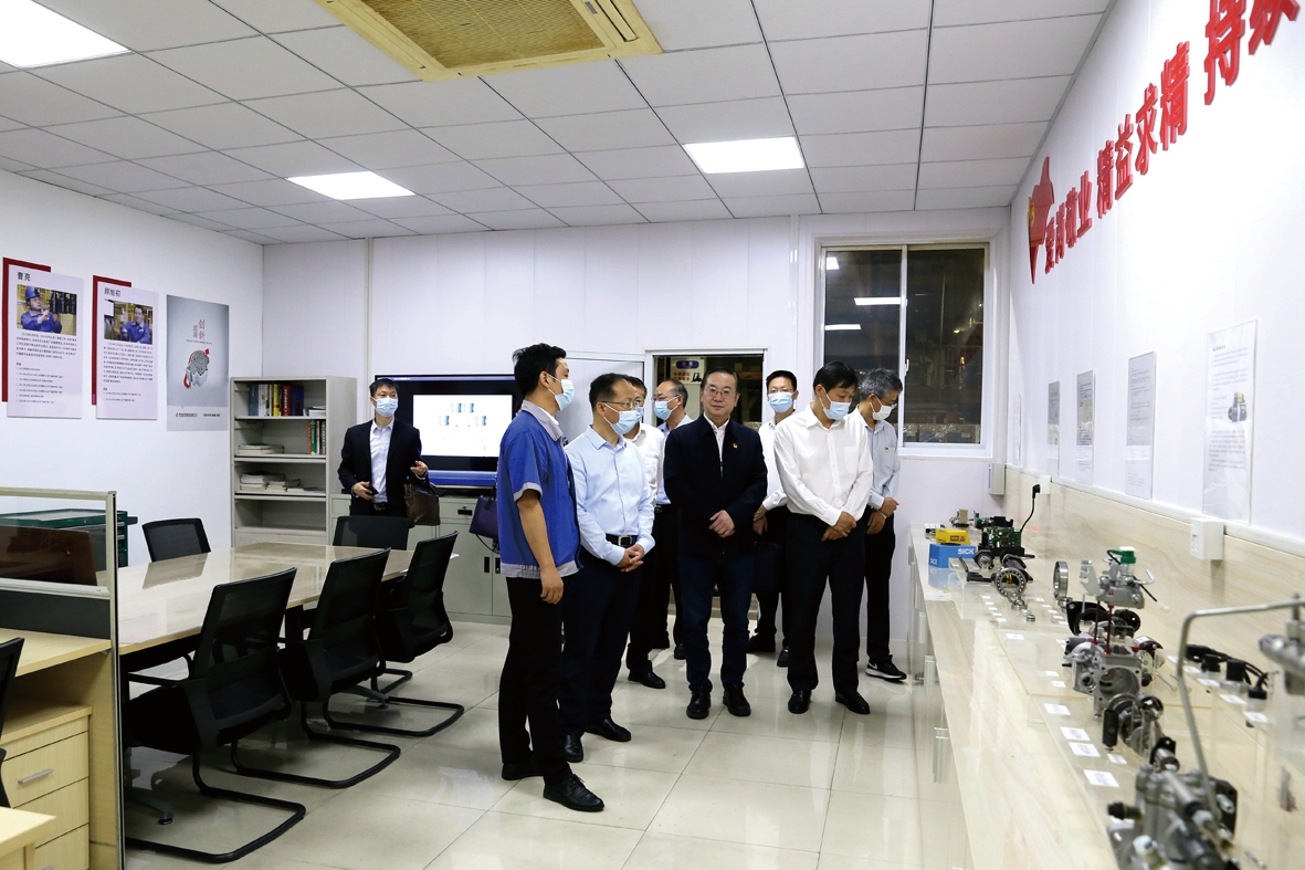 圖為市紀委書記李文宏(前左二)參觀多缸機廠黨員專家工作室