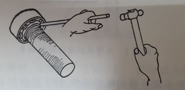 b 注意正確的拆卸方向后可根據(jù)零件的材質,分別采用不同的工具將零件拆下,使用敲擊拆卸的應注意敲擊正確的的部位,防止因敲擊損壞零件(如從曲軸上拆卸滾動軸承時,受力部位應在軸承內圈的四周均勻受力,不得一直敲擊某一邊;從機體拆卸滾動軸承時受力部位應為軸承的外圈四周均勻受力)。